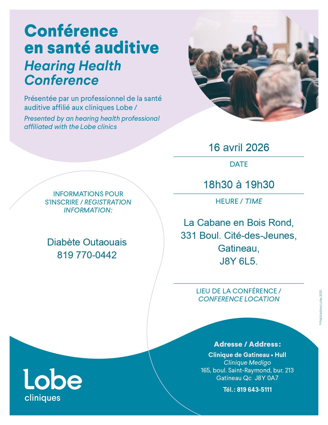 Cette conférence sera animée par un professionnel de la santé auditive affilié aux cliniques Lobe , qui partagera avec nous des informations essentielles sur la prévention, la protection et l'amélioration de notre santé auditive au quotidien.